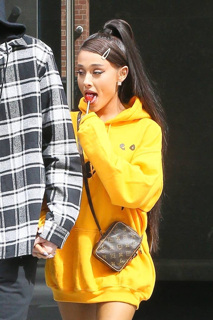 Its the perfect costume for those who love pop culture and want to wear the comfiest clothes possible. The singer in a bright yellow sweatshirt is licking a lollipop and appears to be looking lovingly at davidson who in contrast is hooded and looking down with his face hidden. On june 20th 2018 ariana grande and newly announced fiancee pete davidson were photographed walking in new york city.