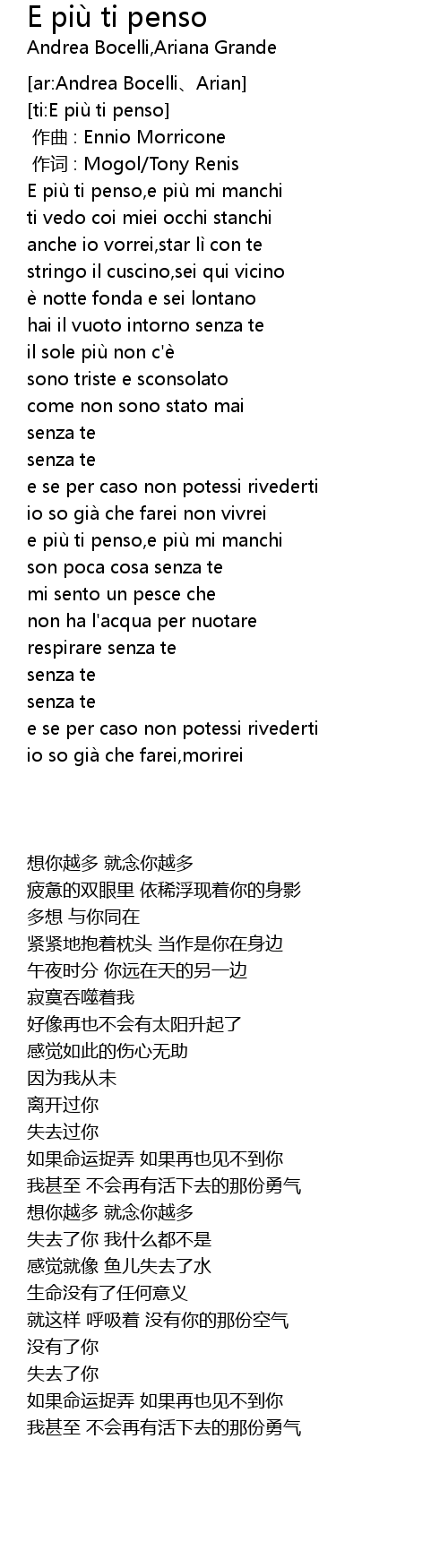 Ariana grande andrea e piu ti penso. Andrea bocelli e piu ti penso e piu mi manchi ti vedo coi miei occhi stanchi ariana grande anche io vorrei star li con te stringo il cuscino sei qui vicino together e notte fonda e sei lontano hai il vuoto intorno senza te il sole piu non ce sono triste e sconsolato come non sonn stato mai senza te senza te together. E piu ti penso album. The song debuted at number one on the billboard classical digital songs chart consequently becoming grandes first appearance on the chart as well.