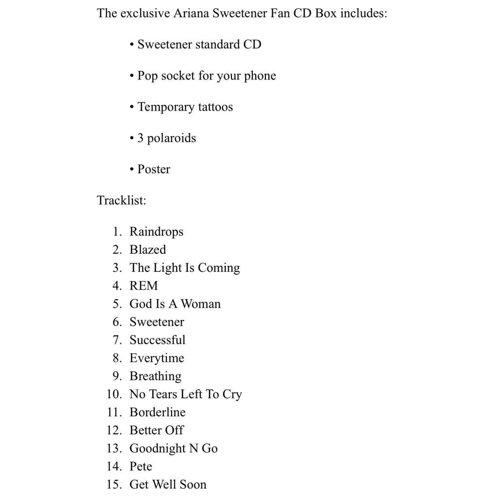 Es gibt zum einem dass normale album und eine fanbox edition. Ariana grande sweetener includes cd pop socket temporary tattoos polaroid photos poster sweetener text is stylised upside down one polaroid has a facsimile signature. Includes no tears left to cry god is a woman.