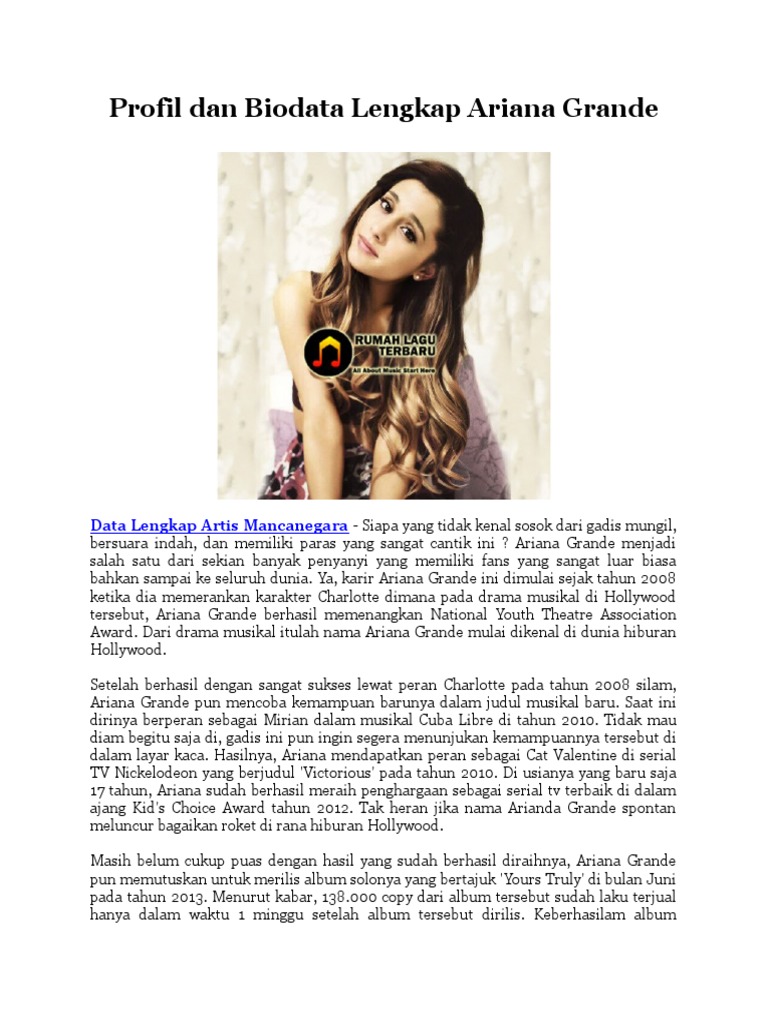 Ariana grande adalah seorang penyanyi artis sekaligus pencipta lirik terkenal di amerika serikat. Berikut biodata lengkap dari umur tinggi badan berat badan pacar agama sampe nomor telepon dan instagram. Profil biografi dan biodata ariana grande beserta foto terbaru tidak sulit mencari biodata ariana grande karena aktris kelahiran boca raton florida amerika serikat ini terbilang sukses sebagai penyanyi internasional meskipun usianya masih muda.