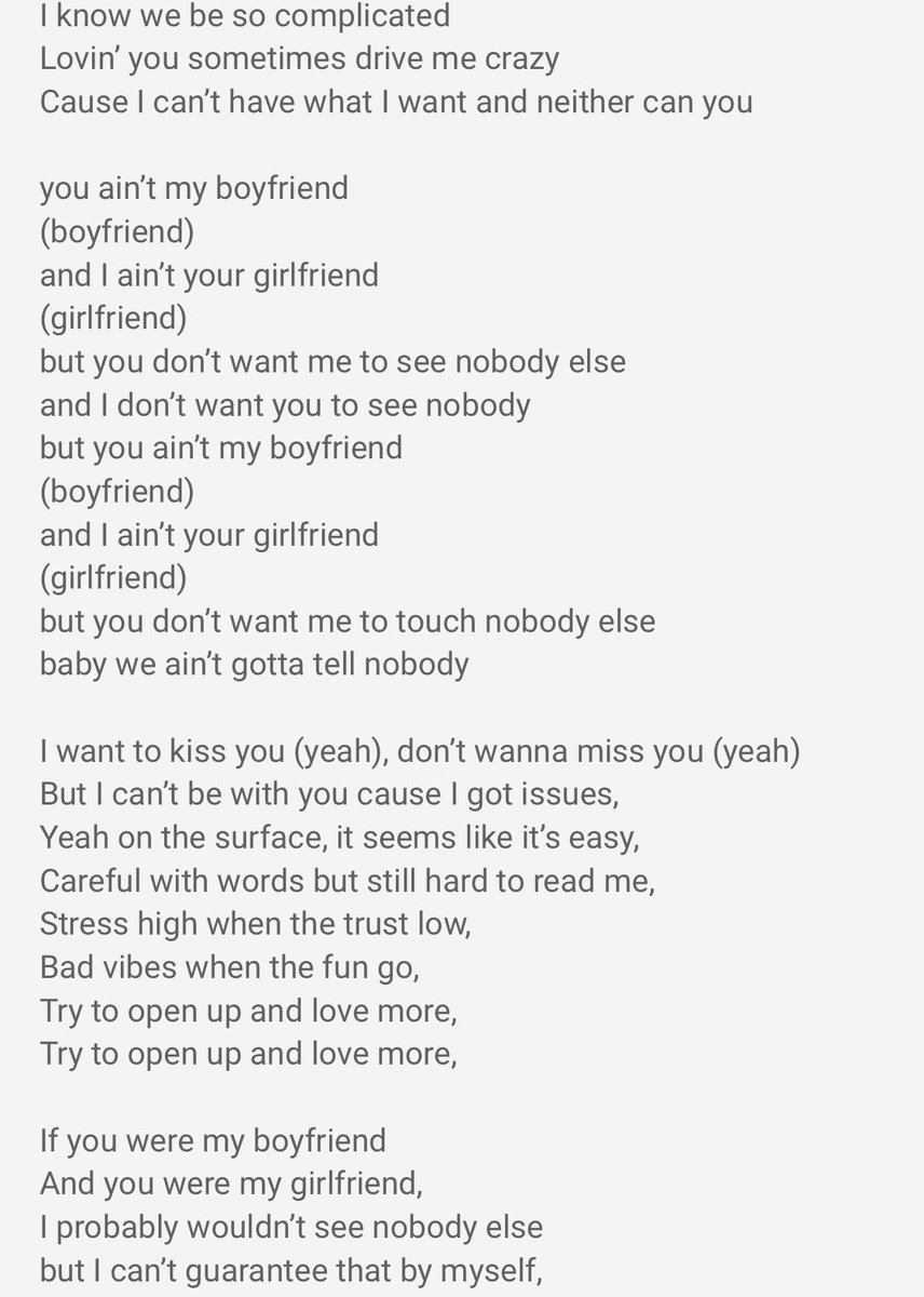 Ariana grande boyfriend letras y cancion para escuchar you aint my boyfriend boyfriend and i aint your girlfriend girlfriend but you dont want me to see nobody else and i dont want you to see nobody. Replaying to a fans question about the inspiration behind this song ariana grande posted the answer on twitter well i feel like this song captures a common theme in the lives of so many people i know.