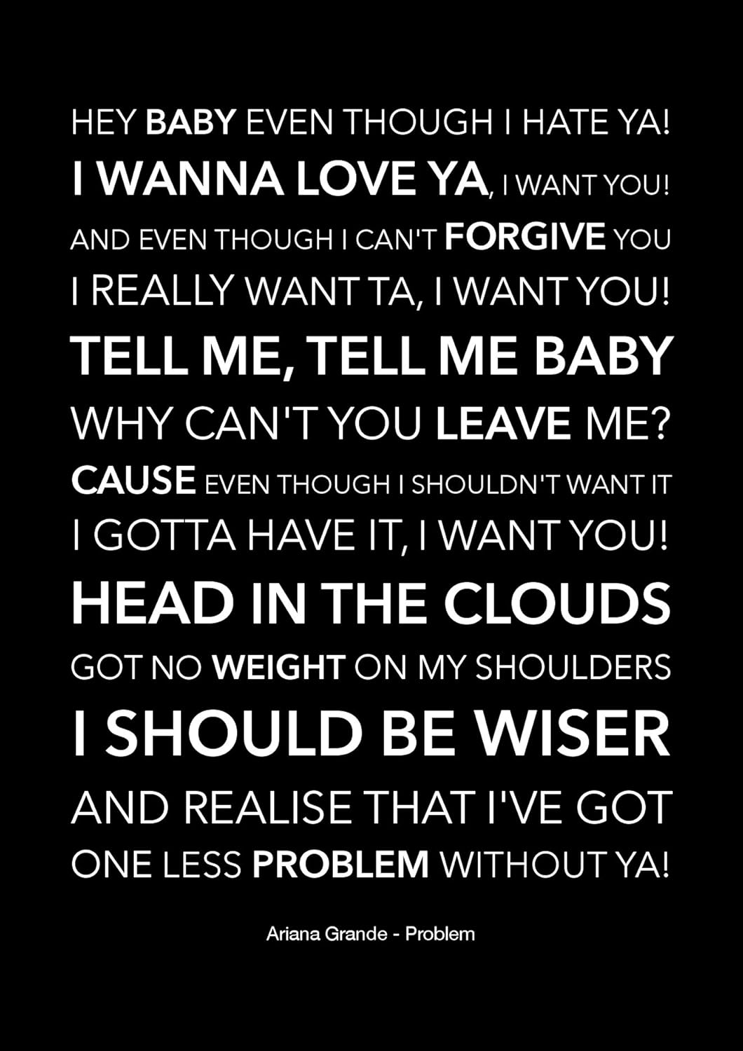 Problem ariana grande lyrics. One less problem without ya. Lyrics to problem by ariana grande. Its an uptempo dance poprb song with a retro feel thanks to its use of saxophone loops.